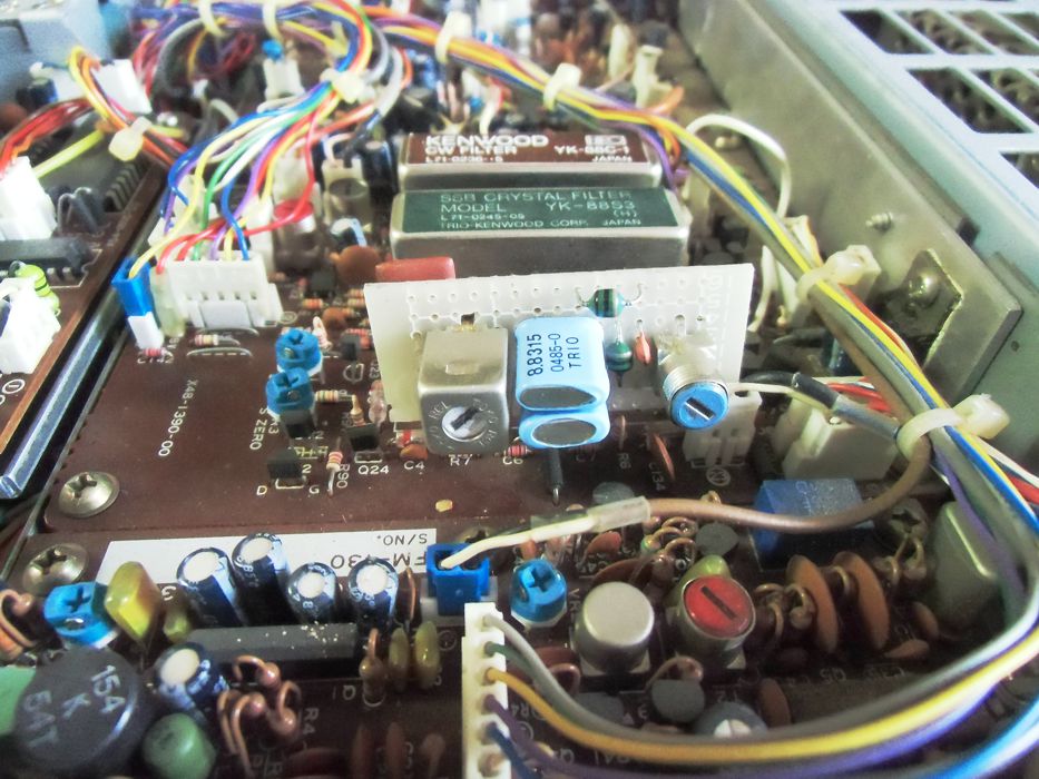 TS-670用AMフィルター ー AM魔界探訪 川島流古いリグ活用法 TL-120懐かしいですね!! 最近、昔のリグ(TS-670)を引っ張り出してAMをたのしんでいます。 本来ならば、HFでは AM は送信できませんが、コントロールユニットの D-54 をカットすると、HF の AM が送信可能になります。(89年ラジオライフ別冊より) 出力は 4W 程度なので、TL-120 を付加し 20W 前後で運用していますが、受信時はSSB フィルターを通るので聞きづらく、FCZ コイル 3 段でやりましたがあまりにも広帯域で使い物になりません。 あきらめかけていたところ、ネットオークションで TS-820 のジャンクを見つけ、格安でゲット。 ![]() ![]()