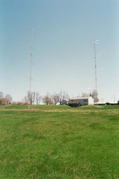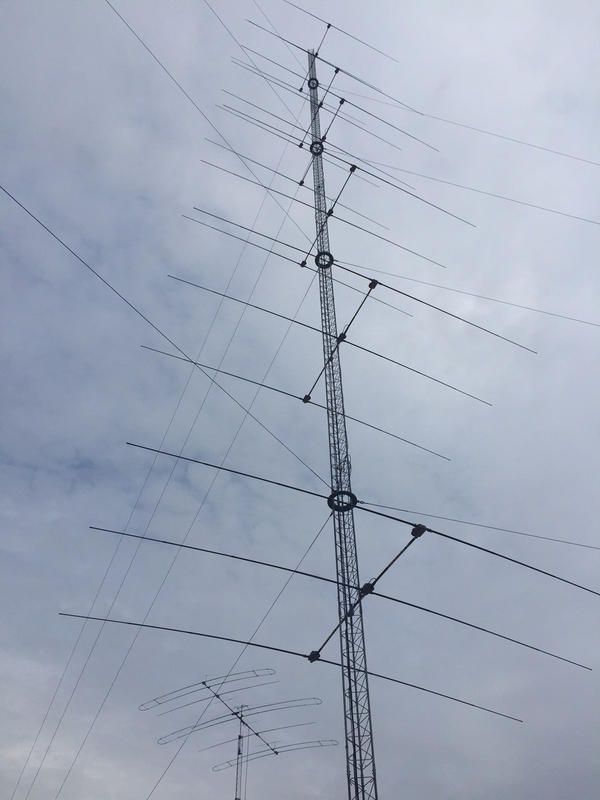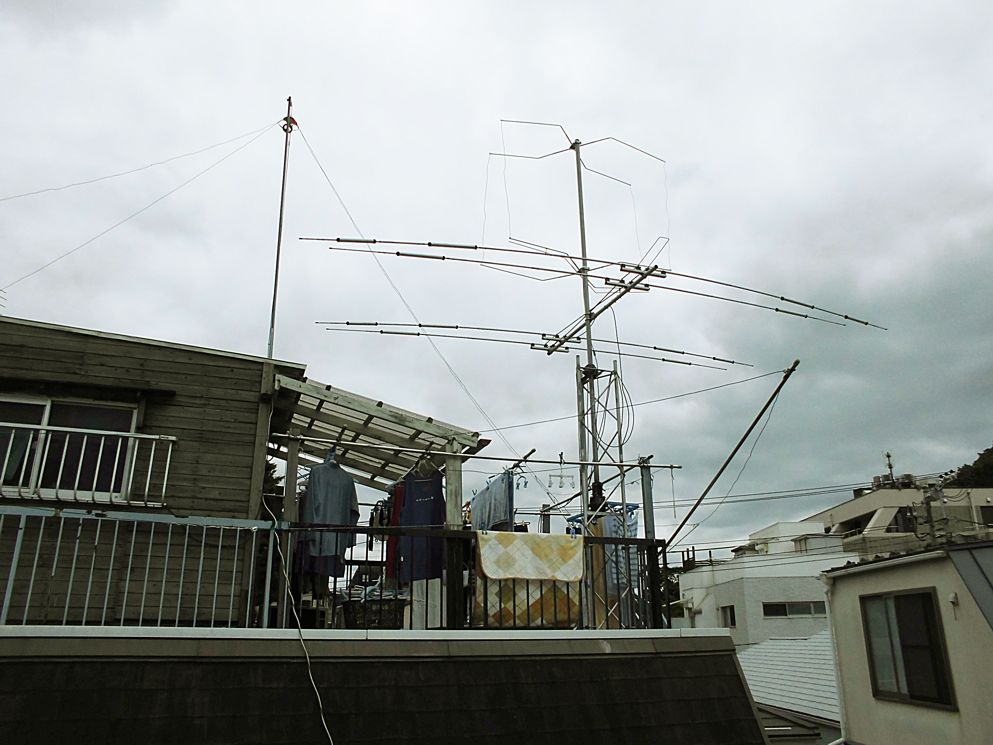 写真は、タワー上から 50MHz 6エレメントHB9CV(ミニマルチ HB066DXC)、14~28MHz 5バンド2エレメント HB9CV(ミニマルチ HX52A)、50 のエレメントの先に見えるポールが、3.5~3.8/7MHzダブル逆Vアンテナです。15mHです。