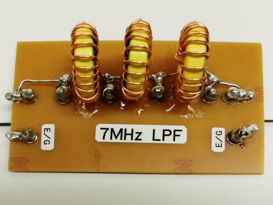 新スプリアス規定対策用LPF の製作 本来はバンドパスフィルターが必要なのですが、一般には LPF が大半のようです。 今回送信出力が 100W 、最低3段で -50dB のフィルターを作っていただきました。 黄色のコア -T-68♯2、エナメル線は電流を考慮して 0.7mm とし、コンデンサはチタコン 2kV とデップマイカ 500V 混合で調整。 スペアナでご覧のように、-50dB 取れてますから、平成17.12.01 以降に製作した自作機の場合の新スプリアス規制に対応しており、既に -40dB はクリアー、さらに π型LPF で -20dB 付ければ -60dB になり,合格点です。 今回の -50dB LPF 付ければ楽勝で、申請出来ます。 7MHz 以外のバンドの LC の値は表の通りです。