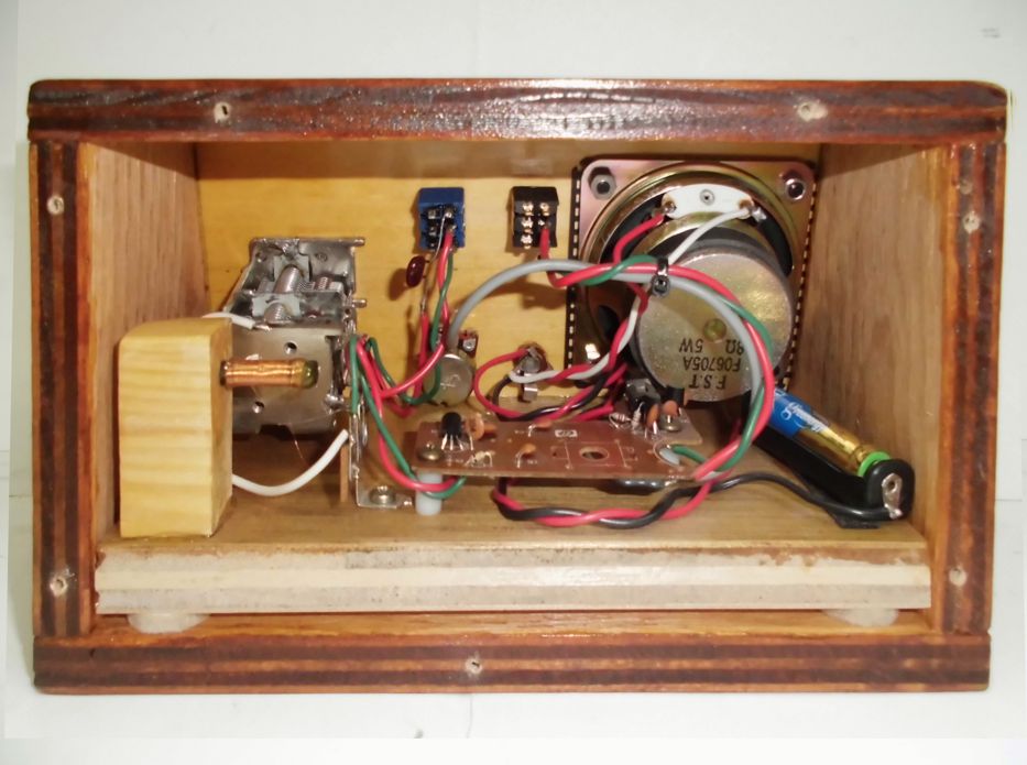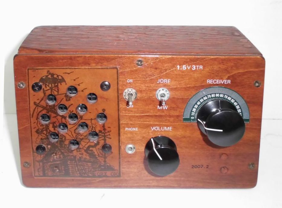 夏休みの工作その2 3年ほど前にハムフェアで販売用ブース出されてるOMに頼んで随分処分してすっきりしたはずなんですが、知らない間に物が増えてます! アワワ、一念発起、随分捨てまして、売れそうなジャンク品をまとめて箱詰めしました。 ナンダカンダいるいらない確認しながらやってると2007年に作った単4電池1本でスピーカがなるラジヲが出てきました。 全然使っていなくて当時は熱にうなされたように作ったのに飽きっぽい性格ゆえ・・・夜中枕元で鳴らしてみました。25mWしか出ませんが寝ながら聞くにはちょうどヨシ!です。 2~3日聞いていましたらムムムとスイッチが入ってしまい、このように変身してしまいました。