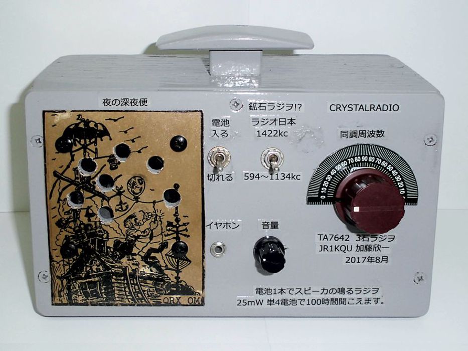 どうも今年はグレーカラーにはまってますね~ 中身は100円ショップで売られていたTA7642/RF増幅/検波とS9014トランジスタ2個でイヤホンを駆動するストレートラジオでライター位の小ささのラジオでした、バーアンテナも随分小さいもので試しにスピーカーつないだら鳴ったです! 私はNHK とTBSしか聞かないですが、ラジオ日本まで全部入ります。 昔中学生の頃、ゲルマラジオ作ってアンテナとアースつけた所ガンガン聞こえるので試しにスピーカーつないだ事ありました。か細い~音で聞こえました。 それよりは遥かに良く聞こえますよ。 アタマにドラえもんのタケコプター風の羽つけましたらあっ!これでいいと思ったまでです。 都内で電界強度が強いですからできたのかも、こんな遊びばかり気の向くまま風のふくままやっとります。 枕元には DSP ラジオは FM東京(ジェットストリーム聞くよう)、3石ラジヲで NHK、防災ラジオで TBS と3台並べてスイッチプチプチやって楽しんでます。同調取り直しが面倒くさいので。 2017/08/20 de JR1KQU 加藤欣一 |