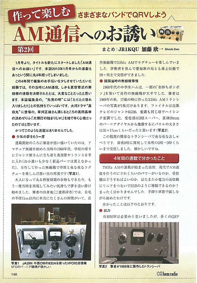 さまざまなバンドでAM通信を!―ホームページ念願の再開です!― AM通信のホームページも丸4年になりまして2016年の10月頃より、ホームページを運営して戴いてるJP7CZE 川辺さんより、色々な情報を載せていますが、テーマ事に窓を作り調べたいテーマについて閲覧者の皆様が容易にたどり着けるように一度整理整頓してみようと思うがとの提案を戴きました。 だけどやるとなると過去の記事を全て読み返してテーマ事に仕分け、まとめるという気の遠くなる作業です。 まして川辺さんは現役の山形大学の教授で学生の講義、その他雑用も多いと聞いておりますので、本当に負担かけるは忍びなく思っていましたが、昨晩深夜2時頃突然!!出来上がったと連絡が入りました。 早速拝見、全体的にシャープになり各テーマ事に非常に見易く編集されています!大変有り難い事です。 どうか皆様も無線機製作のお供に今後もご利用下さいませ。 まずは、ホームページ念願の再開のお知らせです。 7195も日によってコンディションが不安定で冴えません。私は1月中旬より50.500 MHzAM/SSBで毎晩21時台にJL1PSW森谷さんとラグチュウをやっております。お互いスイスクワッドを上げて近いせいもあり59/59 でつながり情報交換しております。22時頃から森谷さんはトレーニングに走りにゆきます。 2月初めにはJH1VRS 杉並区の菅原さんがTR-1000で呼んで戴き50年ぶりでとらせんの音を聞き感動しました。いい音のAM波でした。 皆様も聞こえましたらお声がけ下さいませ。 2017/03/18 de JR1KQU 加藤欣一 |