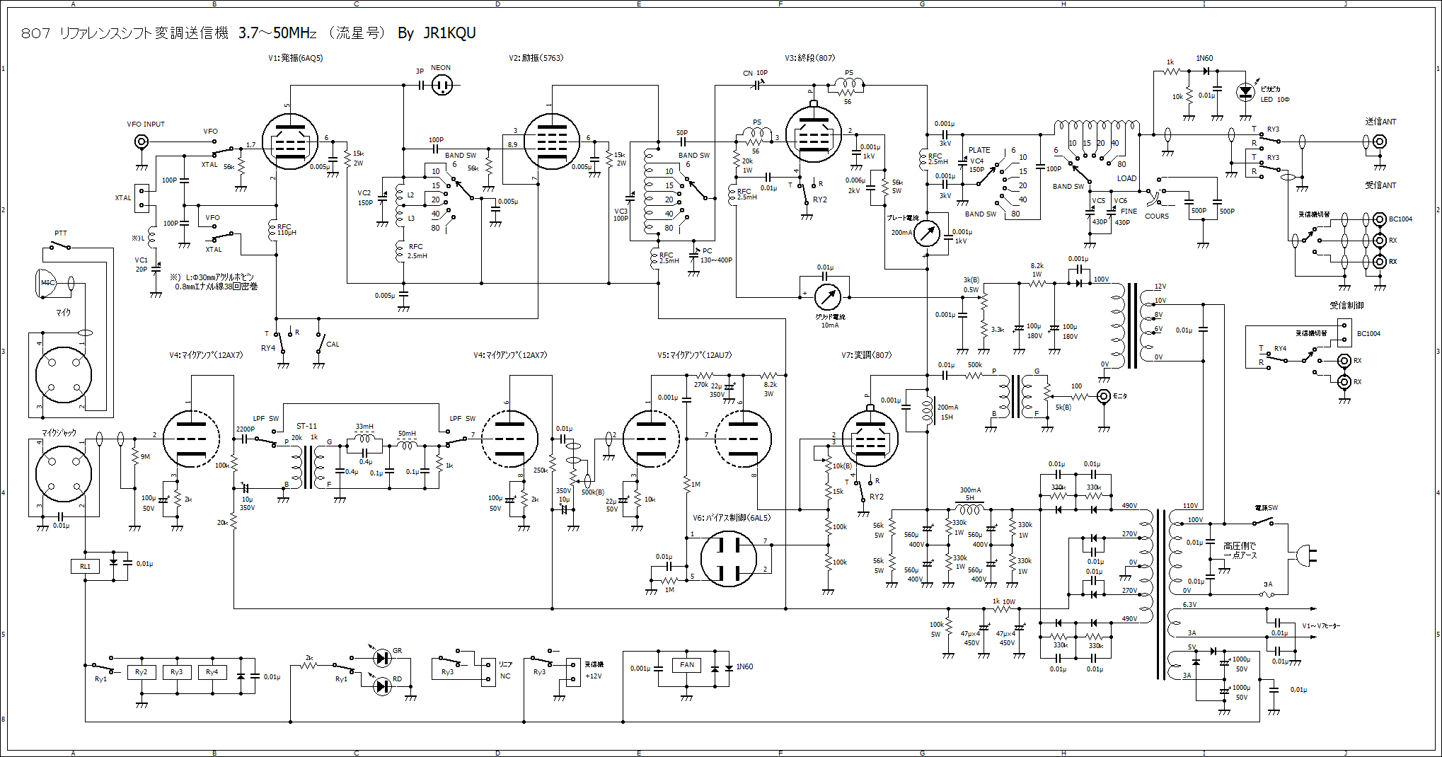 (1)JARL沖縄県支部による、沖縄でアマチュア無線が許可されてから55周年を記念しての「807AM・CW送信機製作コンテスト」に参加させて戴ける機会を得られました事にまずもって感謝致します。 元来、昭和レトロの真空管工作が好きでありますので大変嬉しく勇んで、手持ちのパーツと合わせ3.7/7MHzの2バンド送信機なら直ぐ作れるから思う存分デザイン、付加回路等を加えて十分楽しめるぞとアイデアを膨らませておりました。 (2)8月のハムフェア、仲間のJE1EKH 小野里OMが古いFT243型の水晶再研磨の実演をされ多くの見学者が興味を持って見入ってる情景を目の当たりにしました。 非常に簡単な方法で昔の水晶を研磨し直して現代で使える周波数に作り替えるというものです。 その後、小野里OMより研磨し直し3.7~50MHzまで使える周波数の水晶をプレゼントされました。 (3)う~ん、待てよ!水晶さえあるならと7月に設計した送信機をオールバンダーにすべきだぞと9月に設計やり直しました。 11月初めには制御回路も受信機を3台までコントロール出来るように、併せてリニアアンプも接続コントロール出来る回路も入れてよし、これで行こうと決めアルミシャシーの加工に入りました。 送信機の完成が12月末との予定でした。すでに時間はカウントダウンを始めています。 (4)そうこうしてる内、小野里OMと別件で打ち合わせ中、スーパーVXOの話に今まで発表されてない方法で7MHzで100kHzも安定に動作するリポートを戴きました。 (5)黙って見過ごす手はありません。 急遽、VXOコイルを入れるシールドボックスを作り何とか狭いシャシーに収める事が出来ました。それに伴いパネルにバリコンを取り付けねばなりませんがギリギリの所でクリヤー出来、これなら年末年始で完成までもってゆけるか!!と突貫工事開始です。とにかく毎日少しずつでも良いからコツコツ毎日アルミ板相手に格闘、楽しみながら何とか此処までこぎ着けました。 (6)ドンドン夢が膨らんで気がついたら天まで昇っていたというわけです。 こんなに、送信機作り真面目に納得のゆく加工、半田付け出来たのは初めてです。2017年始まりますと作業時間も随分増えてきました。 (7) この回路で動作すると考えた理由 2007年8月号(?) JARL金沢クラブのクラブ報(?)、2014年9月CQ HAM RADIO別冊QEX JAPAN NO.12? P.11~15? にJA9MH 茶谷OMの807シングル送信機の製作記事を参考に、たまたま電源トランスが全く同じ物をジャンクで手持ちがあり、また変調器も807シングルですが、深く変調かかるようにとJA3KL 下原OMの製作された6146シングルのレファレンスシフト変調の回路を採用させていただきました。 両OMの送信機ともとても素晴らしい音で綺麗に変調がかかりAM送信機の手本のような性能です。 (8)これら貴重な先達のデータがありますからテスト無しでまず安心してうまく動作するはずだと目途をつけ、違う所はオールバンダーにした点です。 発振コイル、段間コイル、バンド切り替えロータリースイッチ等は手に入らないのでトリオのTX-88A送信機のジャンクを再利用しました。配置は難なく動作するよう88Aを見習いました。 (9)2009年に麗人号(3.7~28MHz? 7バンドAM送信機)、2011年に利休号(3.7 ~18MHz AM送信機)製作の経験から、まずもってこれで正常に動作するはずであるとの確信で設計が固まりました。 (10)昔のVFO-1も持っているものですからVFO/XTALの切替を付けました。VXOがきちんとスーパーVXOで動作すればVFOは必要ない話となります。 (11)オールバンダーの為スプリアス規定対策はローパスフィルター等で対処する事とし、音声のサイドが広がらぬように、低周波増幅回路にJA1FT 綿引OM方式のLPFを入れ300~3kHz以外をカットするようにしています。 (12)807シングル送信機流星号の仕様等 シャシー寸法:35×25cmパネル39×18.5cm 重 量:15kg ケース:昭和20年代の乾電池の木製箱を再利用して製作 使用真空管: 送信部:6AQ5-5763-807 変調部:12AX7A-12AU7-6AL5-807レファレンスシフト変調 バンド:3.7~50MHzHFオールバンダー 出 力:30W (13) 流星号は2017年1月22日の締め切りまでには残念ながら完成しませんでした。 電源周り、リレー回路が配線残りました。やがて完成、調整の暁には3.7MHz~50MHzのAM送信機流星号として末永く私の傍で働いてくれる逸品となると思います。