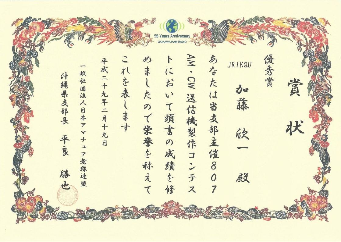 「赤い流星号」が優秀賞-JARL沖縄支部55周年記念807送信機製作コンテストの結果発表- ![]() 実はこれだけではないんですよ!! エントリーした時点で807を2本、他使用する真空管、タンク回路のタイトバリコン、2連バリコン、リレー等主要パーツ一式、沖縄支部より提供して戴きました。807は東芝の元箱入りの新品です。アキバで1本4000円します。大盤振る舞いのコンテストでしたよ。 受賞者の作品を順次CQ誌でご紹介させていただく予定でいます。 なお、コンテストの結果報告は、JARL沖縄支部のホームページでご覧戴けます。 807AM・CW送信機コンテスト結果発表(平成29年3月10日 JARL沖縄県支部 2017/03/19 de JR1KQU 加藤欣一 |