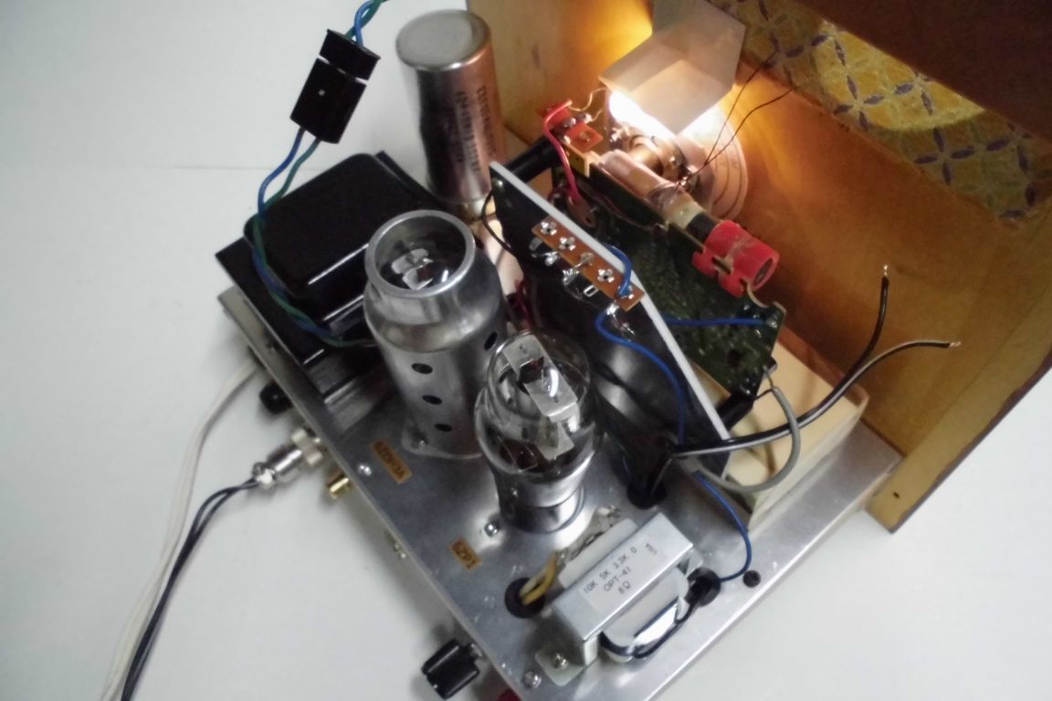 2000 年頃製作したケースが空いてましたので、ジャンクのラジオ基板と 6ZDH3A、6ZP1 のアンプをいれて、なんちゃって真空管ラジオにしました。