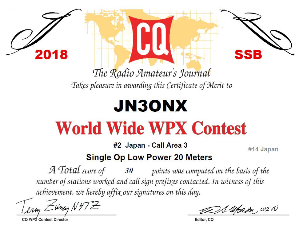 ところが、コンテストの神様は妙なところへほほえむ物で、例えば、CQ-WW SSB などでは、「14MHz lowpower」等という部門があり、それでJAでも各エリア事に1位から運が良ければ5位まで入れるみたいなのです。 ![]() これは、部門を選べば、入賞も夢ではない(例えば、14 MHz QRP で、アンテナは、加藤さんの場合、いつものHX-52Aで、リグはしれっとした顔でいつも通りやるとか。)と思います。