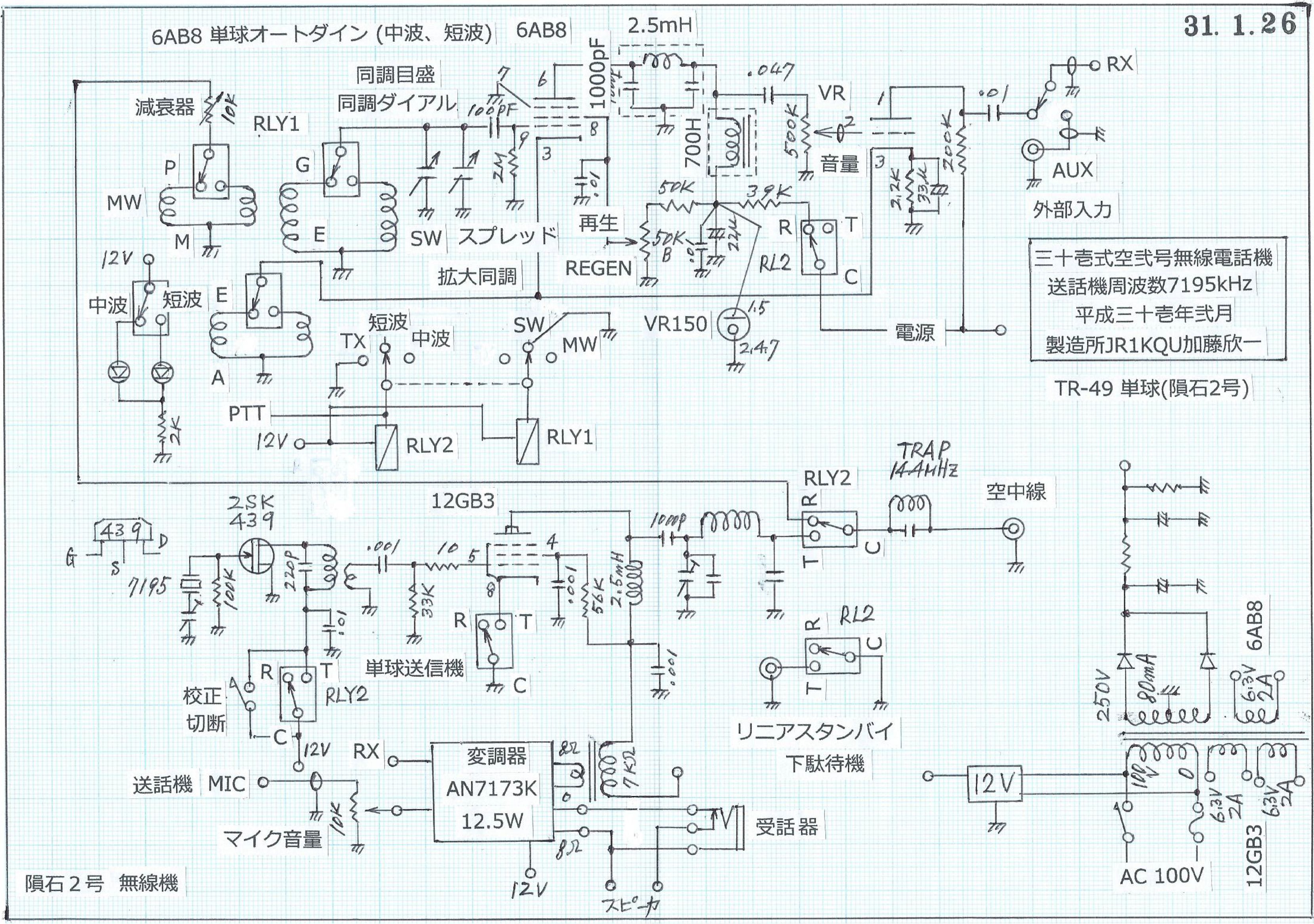 ![]() ラジオ型2球トランシーバの回路図 → PDF 版