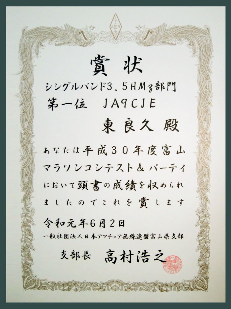 ![]() 平野さん 2 台と小生 1 台 100TH を神通ハムクラブとして、展示しました。 ついでに、2 月頃実施された地元コンテストの、シングルバンド 3.5 MHz の 1 位表彰も受けました。やや自慢話しです。 ![]() 2019/06/12 de JR1KQU 加藤欣一 |