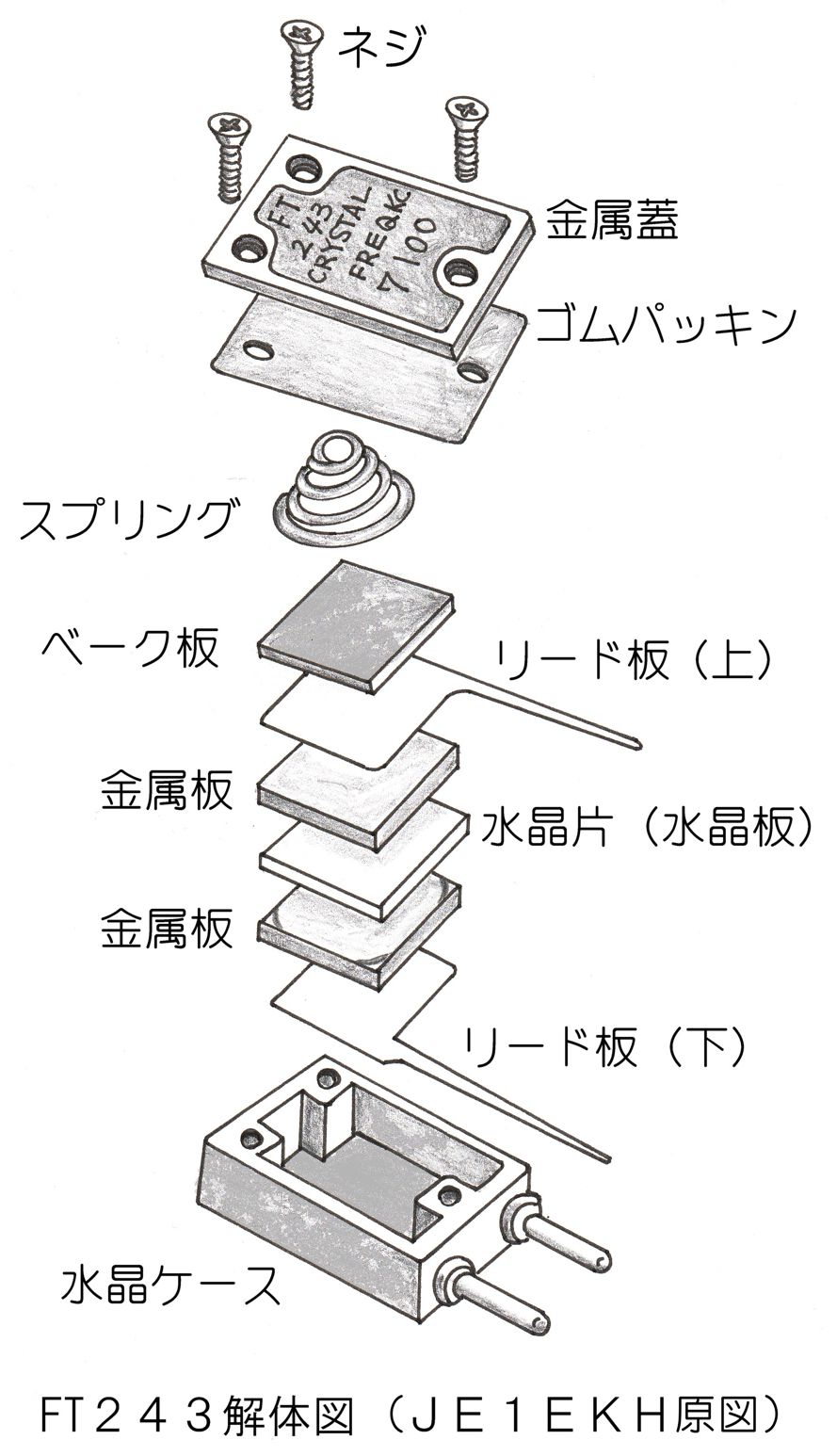 水晶は、目的周波数に近い FT-243 のものを選びます。7,195 kHz や 7,181 kHz なら 7,000 kHz や 7,100 kHz などが理想的です。当然ですが、目的周波数より低いものを選びます。HCー49 などで市販品が安価に入手できますが、ハンドメイドでは採算度外視で挑まなければならないでしょう。しかし達成感が最高潮に至ることはお約束出来ます。