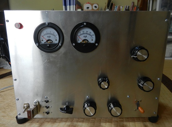送信機は 12B-B14 テレビの水平球ファイナルに 10DE7 でキャリアコントロール変調の 3 球AM送信機です。ファイナルは下から 8mm の LED で光らせ、球がブルーに光ます。